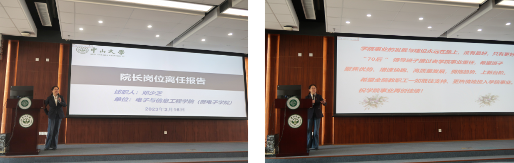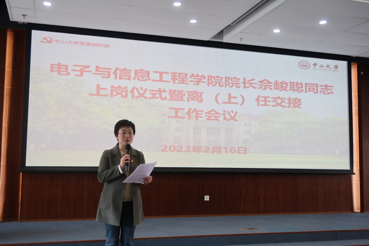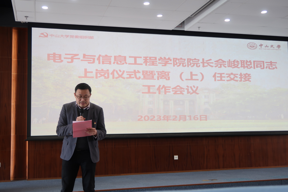 2月16日上午,电子与信息工程学院(微电子学院)召开院长佘峻聪同志上岗仪式暨离(上)任交接工作会议。中山大学副校长杨东华、党委组织部部长杨晓萌,学院全体教职工参加会议。会议由学院党委书记刘飞同志主持。