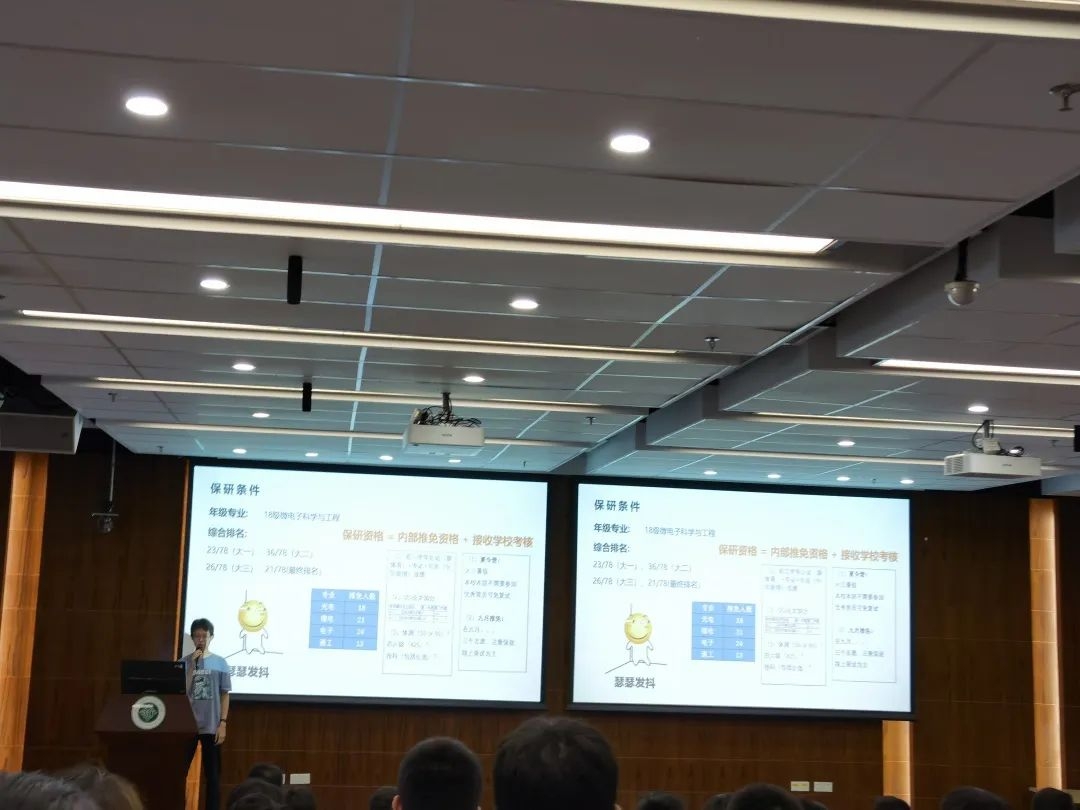 接下来进行的是优秀学生代表的分享交流环节,首先是两位优秀本科学生代表。第一位同学是区卓然,区同学曾获集创赛全国二等奖、国际水中机械人大赛三等奖以及优秀毕业设计等荣誉。区卓然同学本次交流的主题是保研经历和科研成长,区同学以自身经历为例详细介绍了保研的具体过程,总结了三点经验:在保研前期需要达到良好的成绩并参加目标院校夏令营;在保研中期需要选好专业并准备面试;在保研后期需要选导师并开展毕设。