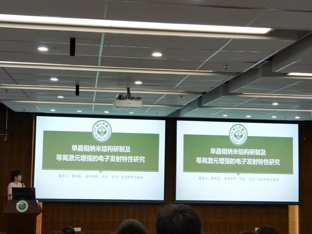 第二位优秀硕士学生代表是韩雨辰同学。韩雨辰同学首先向同学们介绍了自己的研究课题的背景以及具体内容:单晶钼纳米结构研制及等离激元增强的电子发射特性研究。同时,韩雨辰同学也就科研工作的规划提出了自己的看法,认为同学们设定的最佳小目标一定是最适合自己的,建议同学们需制定合理的目标。
