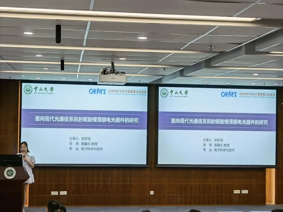 第二位同学是徐梦玥,徐梦玥同学介绍了自己的研究课题——面向现代光通信系统的铌酸锂薄膜电光器件的研究。在具体介绍之前,徐梦玥同学讲述了如何达成高质量产出的建议,包括五点:执行力和独立解决问题的能力、自驱力、把握机会和时间、专注科研以及科研热情。徐梦玥同学的课题介绍包括研究的背景、技术难点与研究目标以及相应的成果。具体成果有:小尺寸铌酸锂薄膜强度调制器、面向相干光通信的铌酸锂薄膜调制器芯片、世界首例铌酸锂薄膜偏振复用相干光调制器以及薄膜铌酸锂平台集成光频梳产生器等。