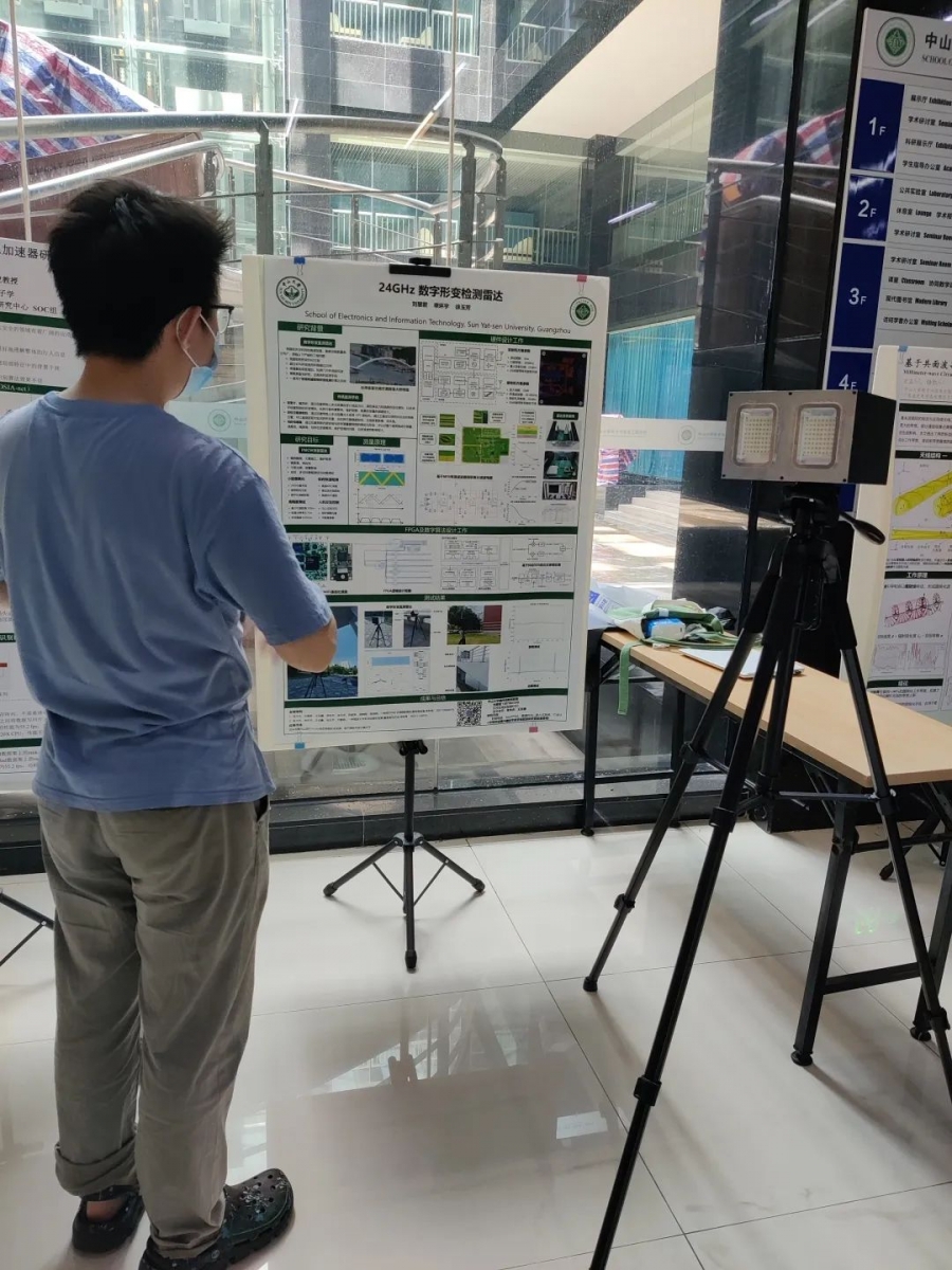 接下来是自由交流与展示,包括实物展示和海报展示。实物展示共有三个展品,其中两个展品来自王凯老师团队,具体为类视网膜图像传感器,包括PD-MOS器件以及根据该器件做成的12X12像素阵列;最后一个展品是来自张木水老师和王自鑫老师团队的24GHz数字形变检测雷达。