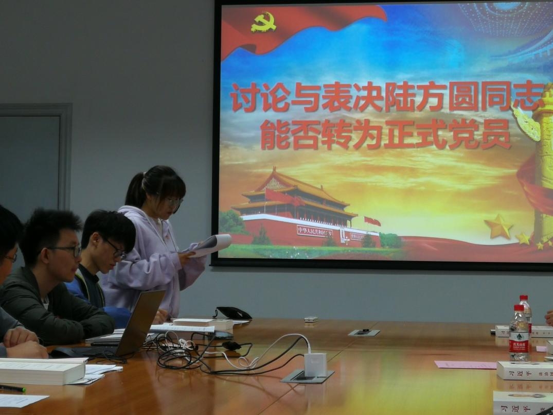 会议开始,支部书记林穆伟同志简要汇报了支部基本情况。紧接着,大会对预备党员陆方圆同志转正事宜进行讨论与表决。通过陆方圆同志一年预备期内的思想与学习情况的汇报,以及入党介绍人吴伟胜同志的情况介绍,与会正式党员经过无记名投票进行表决,同意陆方圆同志按期转为正式党员。
