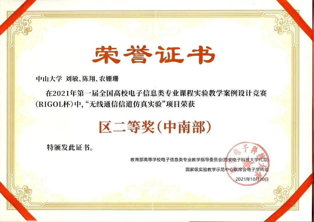 2021年10月30日,电子与信息工程学院实验教学中心刘敏老师牵头、陈翔与农姗珊两位老师参与组建的教学团队,在第一届全国高校电子信息类专业课程实验教学案例设计竞赛中荣获中南赛区二等奖。