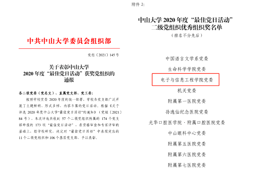 为深入贯彻落实习近平新时代中国特色社会主义思想和党的十九届五中全会精神,坚持“党的一切工作到支部”鲜明导向,全面提升党支部组织力、凝聚力、战斗力,以优异的成绩迎接建党100周年,学校于2021年开展了2020年度中山大学“最佳党日活动”评选工作。学院党委积极组织,师生党支部踊跃申报,经支部报送、学院党委推荐、学校党委评选等环节,我院教职工第一党支部、教职工第五党支部、硕士电子A班第一党支部、博士第一党支部申报项目获评“最佳党日活动”,电子与信息工程学院党委也荣获“优秀组织奖”。