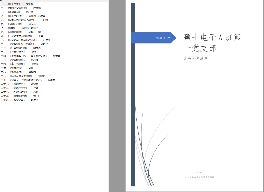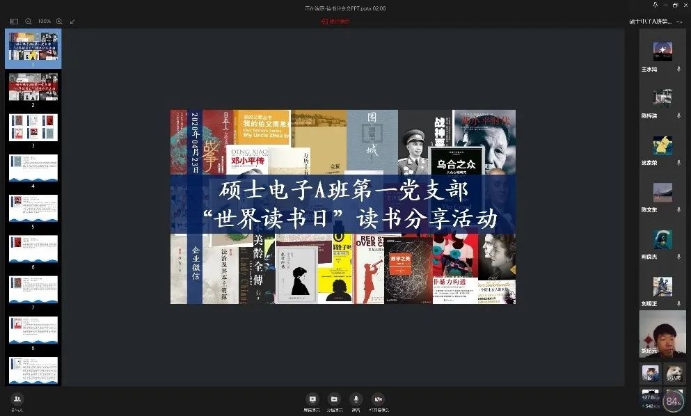 为进一步加强党支部凝聚力,丰富疫情期间居家党员科研学习之余的生活,支部开展了“停课不停学、读一本好书”的分享交流会,党员参与率达到100%,受到支部党员的广泛好评。读书分享主要特色是利用分小组讨论、支部集中推荐的方式使全部党员都能够参与到活动中。通过人物传记如《邓小平传》和《毛泽东传》,党史、战争史的阅读分享,增进了党员对我们党初心和使命的认识,有助于进一步践行“不忘初心、牢记使命”主题教育的深刻内涵。此外,还编撰了《阅读推荐书单》在支部中传阅,让好书被更多人看到。活动最后还评选若干奖项,表彰在读书活动中做到良好表率的个人。