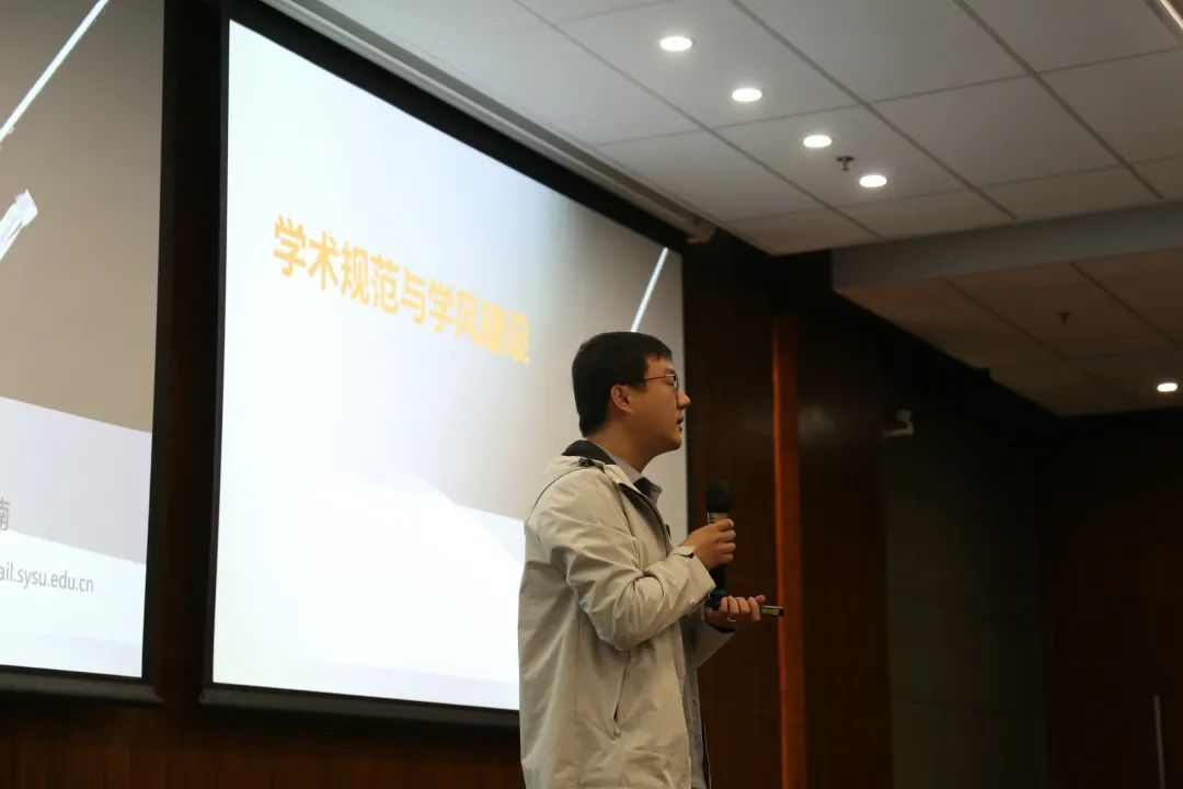 随后,杨楠副教授从中共中央办公厅、国务院办公厅印发的《关于进一步弘扬科学家精神加强作风和学风建设的意见》以及教育部发布的《高等学校预防与处理学术不端行为办法》两份指导性文件开始,对国家层面的相关的指示及制度进行解读,强调了国家对于学术不端行为的“零容忍”。随后,杨楠副教授重点解读了《中山大学学术道德规范》、《中山大学预防与处理学术不端行为办法》、《中山大学博士硕士学位论文抽检处理办法》等与同学们学习科研生活息息相关的学校制度,指出了同学们在学术道德、论文投稿、评优评先以及考试考察等一系列过程都需要遵守的准则,并着重强调学校对于学术不端的学生,其情节严重的,将有权不授予学位或是依法撤销学位。