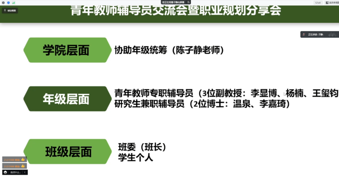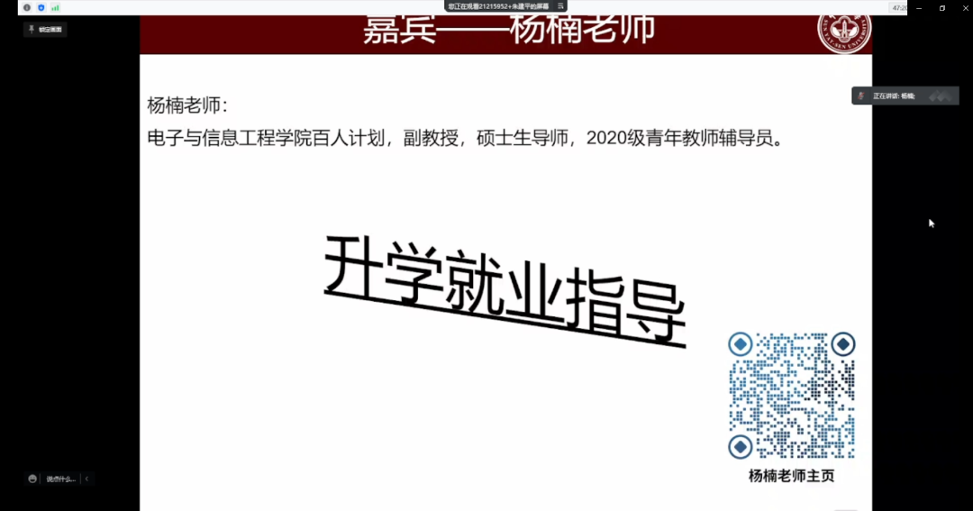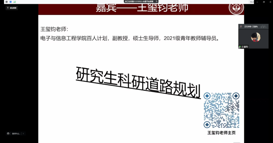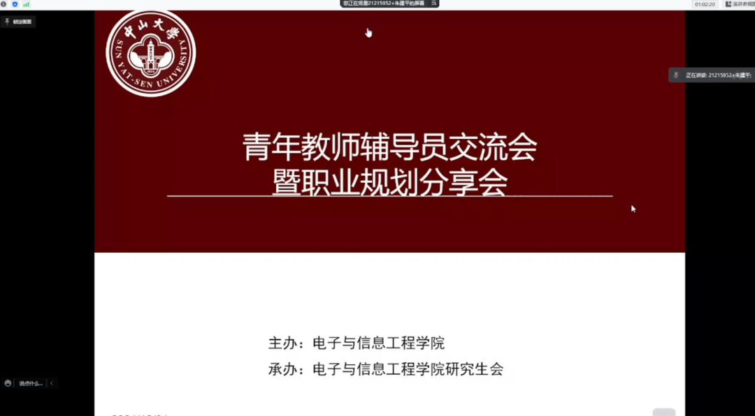 电子与信息工程学院贯彻落实立德树人根本任务,积极响应学校号召,全面推进落实青年教师专职辅导员工作机制,选优配齐建强学生工作队伍,充分发挥出“用最优秀的人培养更优秀的人”的育人效果。为进一步促进师生交流互动,增强青年教师专职辅导员的思想引领、价值引领、学术引领作用,更好地为同学们提供切实有效的服务支持,2021年12月31日,电子与信息工程学院特别通过线上形式举办“青年教师辅导员交流会暨职业规划分享会”活动。本次活动由学院研究生会具体承办,2021级青年教师专职辅导员王玺钧副教授、2020级青年教师专职辅导员杨楠副教授,团委书记陈子静老师以及来自华为公司的孙利滨博士四位嘉宾参与分享交流,活动由朱建平同学主持,共吸引到160多名师生线上参与。
