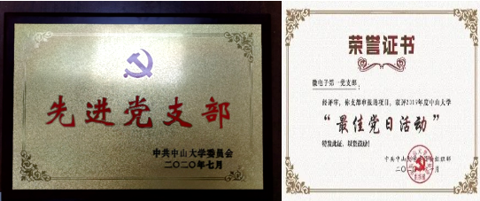 在学校和学院党委的关怀和指导下,在支部全体党员的共同努力下,第一党支部连续三年获得“中山大学先进党支部”称号,支部书记在2021学校党建工作会议上作主题发言并连续三年获得“中山大学优秀党务工作者”称号;同时支部入选第一批“中山大学样板党支部”,中期考核获评“优秀”并顺利验收;成功入选 “广东省党建工作样板党支部”,并获学校推荐申报第三批“全国党建工作样板支部”。